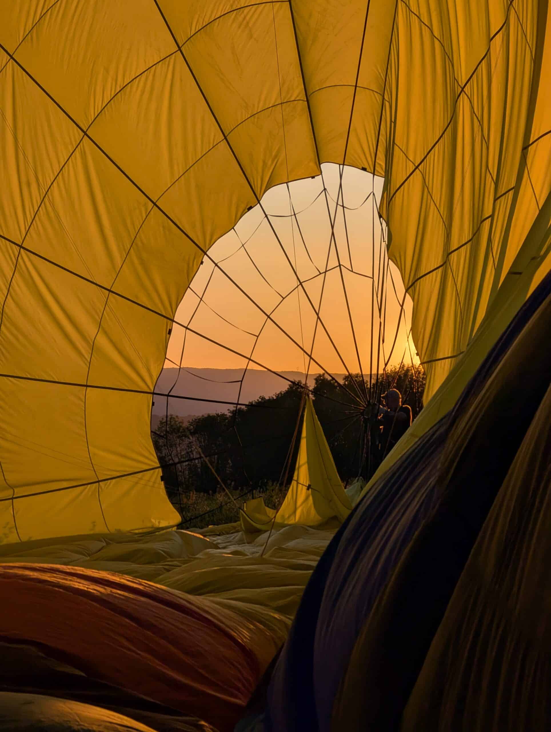 After touching down gently (or sometimes in a controlled glide), the crew and passengers gather around the balloon. We don’t leave just yet. First you have to take care of the canvas giant that carried you up into the air. It’s a very participatory moment, where everyone can get their hands dirty.